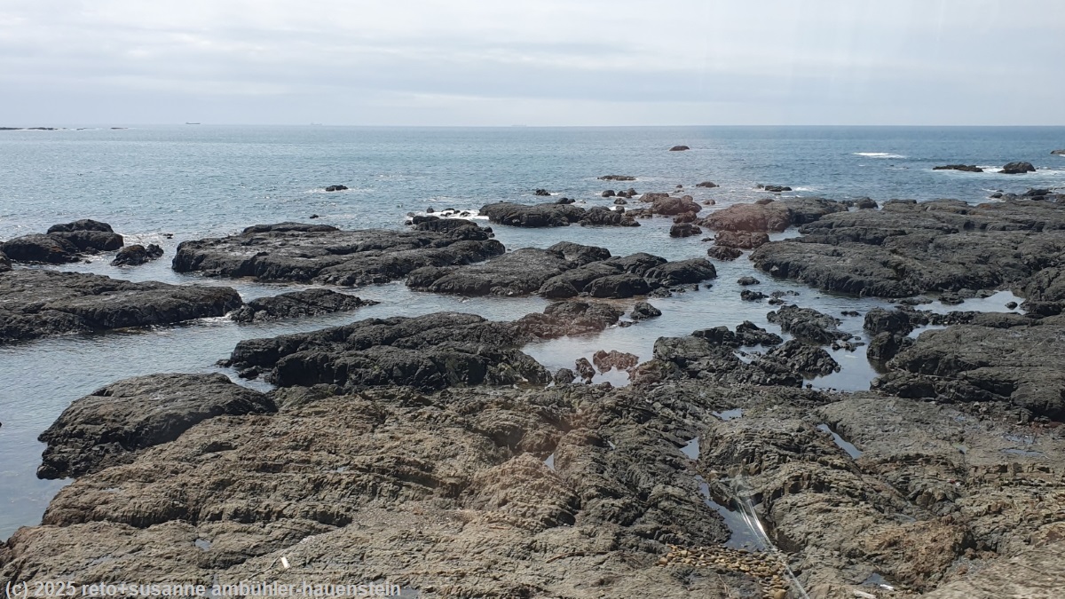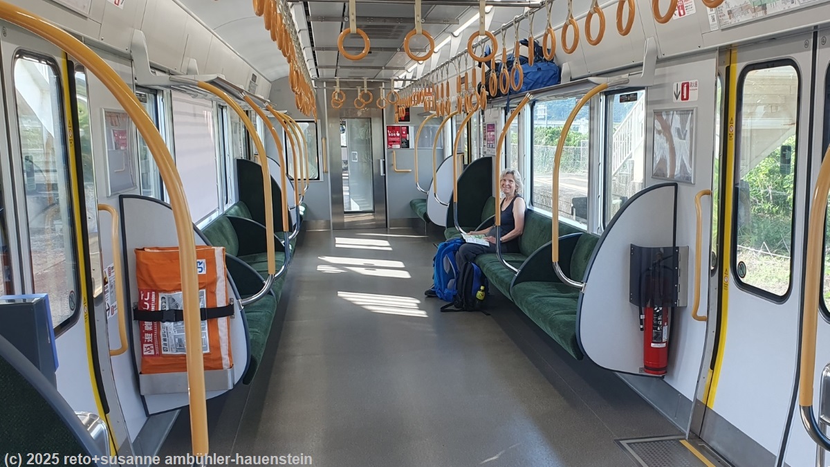 der bus startet hier, das scheint uns der bessere ort, um einzusteigen. dem ist auch so, denn schon bei der nächsten haltestelle sind alle sitzplätze besetzt. pünktlich erreichen wir den bahnhof kii-katsuura. noch immer fällt ein leichter regen. kurz vor dem bahnhof haben wir aus dem bus ein hübsches cafe gesehen. wir bestellen zwei kaffees und setzen uns an einen tisch. da meint susanne: "wann fährt eigentlich unser zug ?" wir haben eine sitzplatzreservation von shingu nach nagoya, auf dieser steht, dass unser zug um 12:45 uhr fährt. nachdem wir diese sitzplatz-reservation gemacht hatten, haben wir aber unseren reiseplan geändert und sind schon in kii-katsuura statt erst in shingu ausgestiegen. entsprechend fährt der zug hier etwas früher - nämlich in sieben minuten, um genau zu sein ! das haben wir total übersehen. wir sagen der etwas verdutzten dame hinter der theke, dass wir sofort zum bahnhof müssten und verlassen das cafe fluchtartig ohne unsere getränke. als wir zum bahnsteig kommen, steht der zug bereits da. er besteht aus nur vier wagen, einer davon ist für fahrgäste ohne sitzplatz-reservation. wir setzen uns auf unsere plätze und packen unser mittagessen aus. die fahrt verläuft angenehm. der zug braucht für die 224 km drei stunden und fünfzig minuten, dabei hält er wohl mindestens ein duzend mal. anfangs folgt das gleis dicht der küste. es hat einen schönen, endlosen kiesstrand. der himmel ist allerdings trüb und verhangen. während wir nordwärts fahren, wird das wetter freundlicher. gelegentlich scheint sogar etwas die sonne. zumindest ist es nun trocken. wir lesen und ich führe dazwischen die bücher nach. der zug trifft pünktlich um 16:15 uhr in nagoya ein. nach dem sehr angenehm ruhigen tag gestern, brauchen wir einen moment, um uns an den grossstadt-trubel zu gewöhnen. im bahnhof sind enorm viele leute unterwegs. bald haben wir den ausgang gefunden und stehen schon wenige minuten später vor dem hotel. das einschreiben geht zügig. für einmal sind wir nicht zuoberst einquartiert, sondern im zweiten stock - was wir als ersten stock bezeichnen würden, denn in japan ist das erdgeschoss der erste stock. wir richten uns ein und kaufen zwei fahrkarten für den shinkansen von nagoya via tokio nach hakodate für den 3.6.2025. danach wollen wir essen gehen. vorher möchten wir noch die niederlassung des autoverleihs finden, damit wir morgen wissen, wohin wir gehen müssen. die suche wird zu einer wahren odysee. in der buchungsbestätigung steht: "verlassen sie den bahnhof nagoya durch den taikodori ausgang und gehen sie eine minute um die station zu finden". so weit vom bahnhof entfernt sollte sie also nicht sein. auf der karte meines navis ist eine niederlassung der "nissan car rental" eingezeichnet, aber an der angegebenen position hat es bloss eine "girls bar". wir gehen durch die strassen rund um die adresse und finden schliesslich einen toyota und hertz verleih. wir fragen nach, ob wir hier richtig seien, aber man schickt uns an eine adresse am anderen ende des bahnhofgebäudes. dies ist jedoch wieder eine niederlassung des toyota verleihs und die beiden damen am schalter können uns auch nicht weiterhelfen. schliesslich hat meine frau die tolle idee, auf google map mit hilfe der telefonnummer zu suchen. die gefundene adresse liegt gerade um die ecke beim ersten toyota verleih - und siehe da, hier sind wir richtig. die dame am schalter meint, sie seien im märz umgezogen, das erklärt einiges. diese niederlassung ist keine 300 meter von unserem hotel entfernt, das passt tiptop. bloss gut, haben wir diesen irrlauf heute ohne gepäck gemacht. morgen mit den schweren rucksäcken hätten wir das weniger lustig gefunden. nun können wir uns endlich auf die suche nach einem restaurant machen. meine frau meint, wir sollen es im oder um den bahnhof versuchen. heute steht uns der sinn gar nicht nach japanischem essen. als wir auf einem restaurant-verzeichnis ein italienisches restaurant im zwölften stock finden, sind wir uns rasch einig. im "mano magio" gibt es ein "dinner set für zwei". dieses umfasst einen salat, eine pizza und pasta sowie zwei getränke. die einzelnen speisen kann man aus der karte auswählen. wir bestellen einen salat aus zehn gemüsen, eine pizza mit schinken, käse und ruccola sowie spaghetti mit käse. das schmeckt sehr gut. wir runden das mahl im starbucks mit kaffee, tee und einem stück erdbeertorte ab. zufrieden kehren wir zum hotel zurück. wir duschen, lesen, führen die bücher nach und löschen gegen 23 uhr das licht.