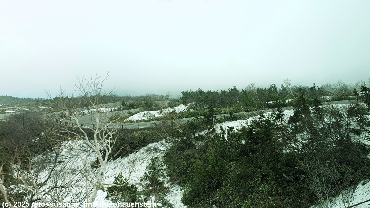 die standseilbahn ist zwar gut besetzt, aber nicht ganz voll. der bähnler am eingang meint zwar, wir hätten die 9-uhr-bahn verpasst, lässt uns aber einsteigen. die fahrt zur bergstation bijodaira dauert 10 minuten. die ganze strecke bis auf die letzten paar meter vor der bergstation verläuft in einem tunnel. in bijodaira steigen wir in den tateyama highland bus um. dieser bringt uns in 50 minuten nach murodo, dem mit 2450 m.ü.m. höchsten punkt der alpine route. die fahrt über die schmale und kurvenreiche strasse ist fantastisch. für privatwagen ist die strasse gesperrt, es sind nur busse unterwegs. auf etwa 1500 m.ü.m erreichen wir die ersten schneefelder. manche bäume sehen etwas mitgenommen aus vom vielen schnee. wir fahren durch einen wunderschönen wald, der sich mit zunehmender höhe laufend verändert. besonders fallen mir die japanischen birken auf, die deutlich grösser sind, als die birken auf dem schwedischen fjäll. kurz vor ankunft in murodo fahren wir zwischen bis zu 15 m hohen schneemauern hindurch, das ist sehr beeindruckend.
