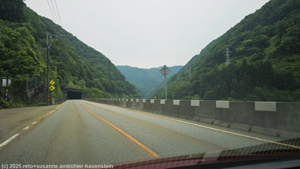 um 16:45 uhr sind wir wieder bei der bushaltestelle. eine viertelstunde später fährt der bus, der uns zum parkplatz zurück bringt. auf dem weg zu unserem tagesziel fahren wir auf der E67 durch den selben tunnel, durch den auch der bus gefahren ist. vor dem zweiten tunnel biegen wir aber rechts ab und bleiben so auf der strasse 158. diese führt uns kurvenreich und durch zahlreiche tunnels richtung matsumoto. nach 20 km sollten wir in die strasse 84 abbiegen. weil die abzweigung zwischen zwei tunnels liegt und rechtsabbiegen verboten ist, müssen wir auch durch das zweite tunnel fahren, dann bei einer schlaufe wenden und nochmals durchs zweite tunnel fahren. nun dürfen wir nach links in die strasse 84 abbiegen (zur erinnerung: in japan wird links gefahren). diese ist nicht weniger kurvenreich und führt in mehreren haarnadelkurven bergwärts.