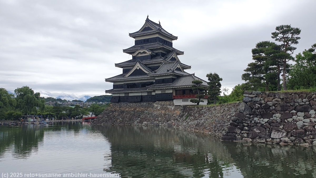 unser handy weckt uns um 07:30 uhr. obwohl das gebäude sehr hellhörig ist, war es beide nächte sehr ruhig und wir haben wunderbar geschlafen. wir frühstücken auch heute in der gemeinschaftsküche. die benutzung ist angenehm, alle gäste sind sehr rücksichtsvoll. nach dem frühstück packen wir unsere rucksäcke und machen uns gegen 09:30 uhr auf den weg richtung matsumoto. die fahrt über die strasse 84 bis zu den beiden tunnel im verlauf der strasse 158 verläuft äusserst entspannt, es sind kaum andere fahrzeuge unterwegs. das ändert auf der strasse 158 schlagartig. ein superlangsam fahrer schleicht über die kurvenreiche strasse und rollt äusserst zögerlich durch die vielen tunnel. als wir uns matsumoto nähern rollt der verkehr vorübergehend ein bisschen zügiger. aber in der stadt herrscht stehender kolonnenverkehr. es ist eine unendliche geduldsprobe, bis wir endlich das schloss erreichen. der parkplatz beim schloss ist voll, doch es dauert nur einige minuten, bis ein feld frei wird für uns. der himmel ist auch heute grau und verhangen. unterwegs fielen einige regentropfen, aber in matsumoto ist es trocken. wir spazieren durch den schlosspark, verzichten aber auf den eintritt ins schloss.