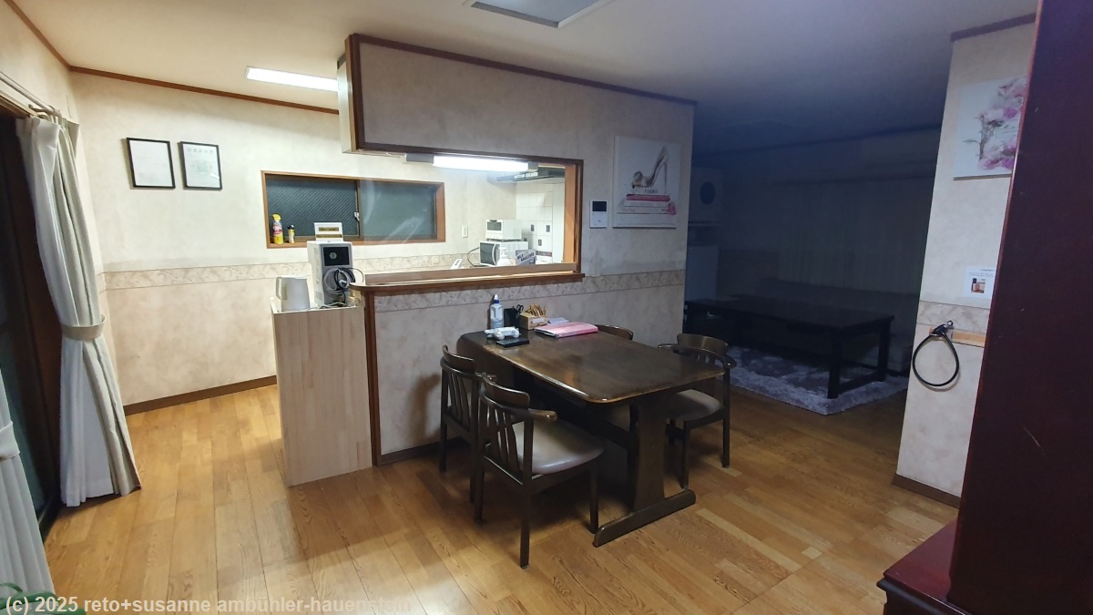 gegen 15:30 uhr erreichen wir unser tagesziel nakatsugawa. da unsere unterkunft keine parkplätze anbietet, parkieren wir unseren wagen beim einkaufszentrum valor ganz in der nähe. von da marschieren wir erst zur unterkunft. wir haben etwas mühe, diese zu finden, denn wir haben bloss einen namen in japanischer schrift. in der email mit der reservationsbestätigung gibt es zwar einen link zur wegbeschreibung, aber der eingang ist so unscheinbar, dass wir erst daran vorbeigehen. schliesslich haben wir das haus gefunden. an der tür steht, dies sei ein unbedientes gasthaus, die zugangcodes für den haupteingang und die zimmertüre würden einem per email zugestellt. tatsächlich finde ich im posteingang eine nachricht von dieser unterkunft mit den zahlenkombinationen. das zimmer ist schlicht aber schön und zweckdienlich.