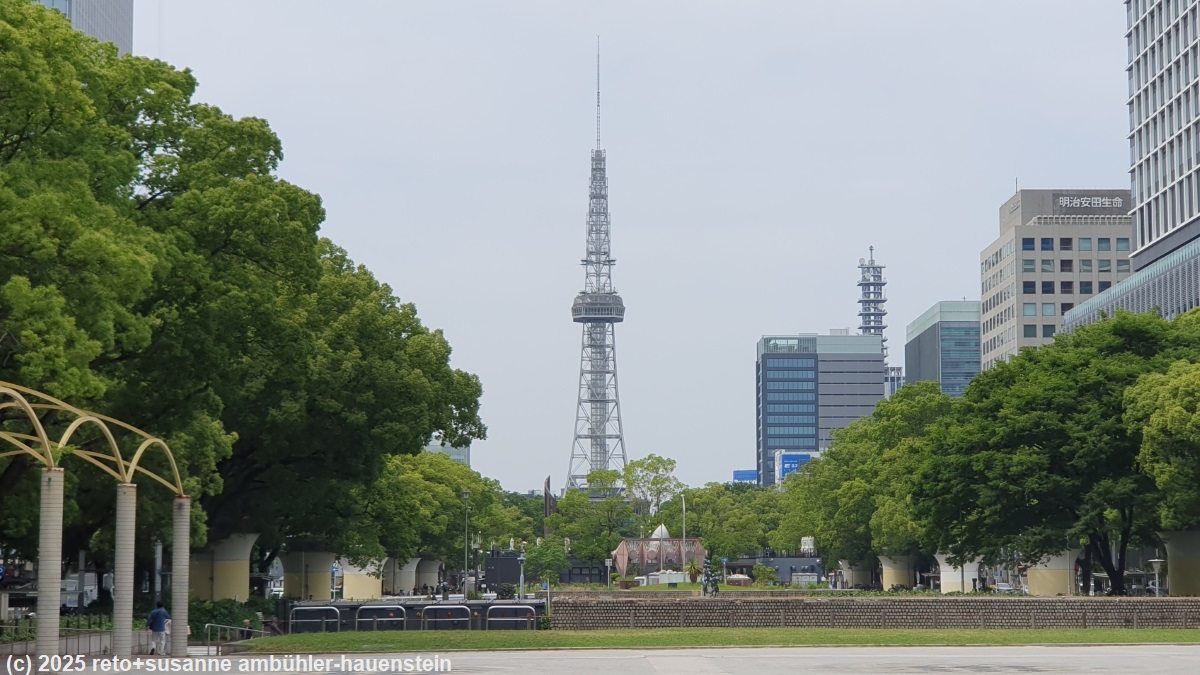 der hisaya odori park ist ein 2 km langer grünstreifen mitten in der stadt. am südlichen ende befindet sich der maezu park. im norden endet der park an der hisayabashi. im etwa 70 meter breiten park gibt es fusswege, kleine bistros, brunnen und wasserspiele. in seiner länge wird der park immer wieder durch quer verlaufende strassen unterbrochen. die hauptattraktion in diesem park ist der chubu electric power mirai tower, welcher auch als nagoya TV turm bezeichnet wird. die aussichtsplattform dieses turms ist unser nächstes ziel. schon von weitem sehen wir ihn in den himmel ragen.