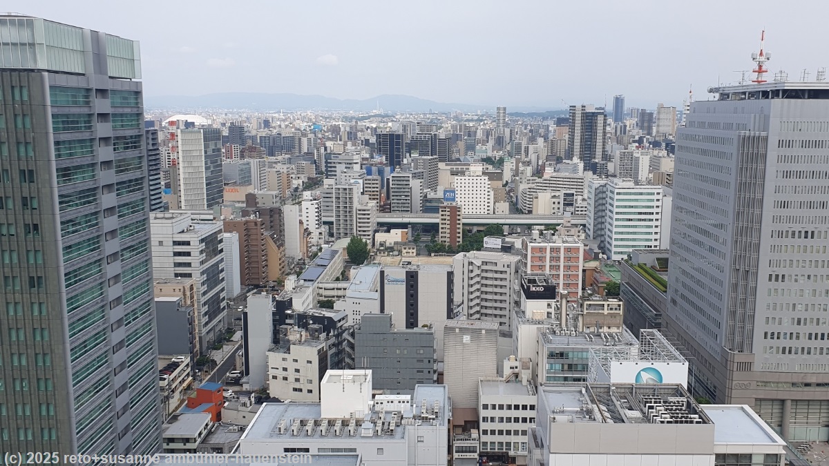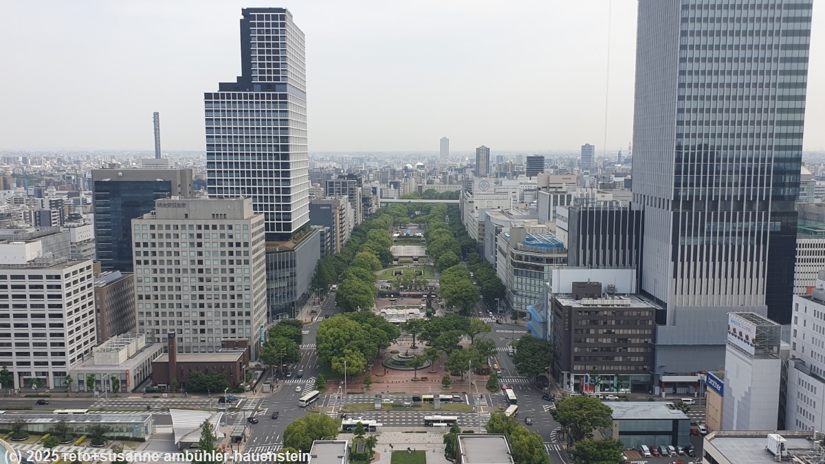 die nacht war relativ ruhig, aber ab 6 uhr wird es ziemlich laut. leute marschieren durchs haus und jemand trocknet sich unüberhörbar die haare mit einem föhn. als wir gegen 07:30 uhr aufstehen, sind wir erstaunlicherweise ganz alleine in der unterkunft. so können wir in der gemeinschaftsküche in ruhe frühstücken. danach packen wir unsere rucksäcke und marschieren zum parkplatz, auf dem unser wagen steht. die sonne scheint und es ist ziemlich warm. wir machen unser auto startklar, danach bezahlen wir die parkgebühr, welche uns mit JPY 1200 (ca. CHF 8) für zwei tage sehr günstig scheint. die anfahrt zur autobahn wird wie üblich durch dichten verkehr und unzählige ampeln verzögert. das ändert sich schlagartig, als wir auf die autobahn einfahren. es hat nur wenig verkehr, darunter bemerkenswert viele lastwagen. diese sind jedoch deutlich kleiner als was wir uns von zuhause und vorallem von deutschland gewohnt sind. die zügige fahrt wird durch einige baustellen mit einspuriger verkehrsführung nur geringfügig gebremst. das wetter bleibt freundlich, auch wenn nun mehr wolken aufziehen. als wir uns nagoya nähern, nimmt der verkehr zu. da wir eine erste ausfahrt verpassen, machen wir einen kleinen umweg. trotzdem erreichen wir das stadtzentrum gegen 10:30 uhr. am bahnhof vorbei nähern wir uns dem nissan autoverleih. doch bevor wir den wagen abgeben können, müssen wir ihn noch volltanken. danach schaffen wir auch noch den letzten kilometer unbeschadet. die abgabe des wagens verläuft unkompliziert. während das auto bei der übernahme sehr gründlich angeschaut und jeder kleinste kratzer vermerkt wird, interessiert bei der abgabe bloss, ob der tank voll ist. wir sind mit dem kleinwagen sehr zufrieden. für 806 km haben wir 36.8 l benzin verbraucht, das sind 4.6 l pro 100 km. dafür haben wir umgerechnet CHF 39 bezahlt. wir marschieren mit unserem gepäck zum nahen hotel, welches wir schon von unserem besuch vor zehn tagen kennen, und deponieren unsere rucksäcke. auch wenn eine dünne wolkenschicht den himmel bedeckt, so ist es mit 27°C sehr warm. wir gehen als erstes zum bahnhof und trinken etwas, ich esse dazu eine kleinigkeit. danach beziehen wir an einem automaten unsere fahrkarten für die morgige zugsfahrt von hier via tokyo nach hakodate. das klappt zu unserer beruhigung hervoragend. nun haben wir noch einen guten halben tag zeit, nagoya zu erkunden. als erstes fahren wir mit dem aufzug in den 15. stock des JR towers. von hier haben wir einen schönen ausblick auf die stadt.