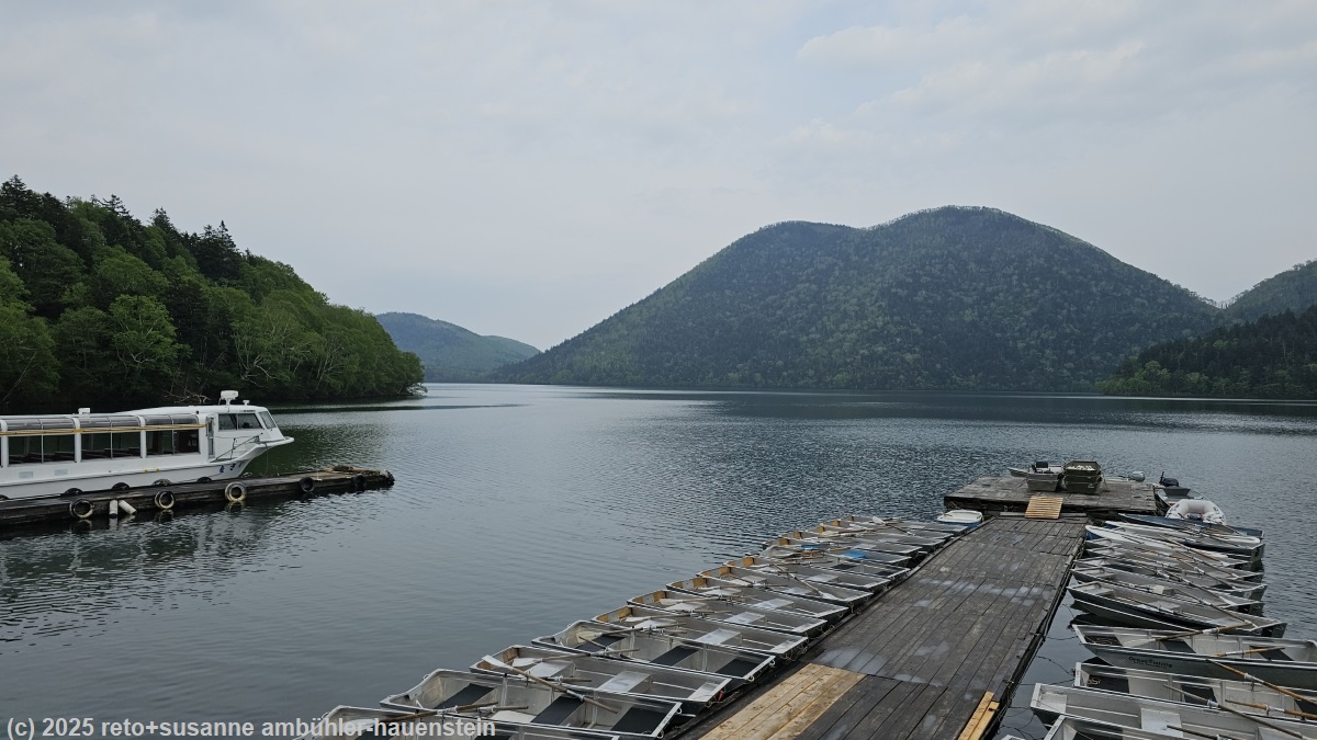 das glück ist aber nur von kurzer dauer, schon fegt die nächste regenzelle über die berge. auf der weiterhin kurvenreichen strasse 273 fahren wir talwärts. am südlichen ende des lake nukabira biegen wir auf die strasse 85 ab. diese ist deutlich schmaler und noch kurvenreicher. die fahrbahn ist in einem fürchterlichen zustand, wir werden heftig durchgeschüttelt, auch wenn ich mir alle mühe gebe, den schlaglöchern und rissen in den strassen auszuweichen. zudem ist die fahrbahn mit ästen und blättern übersät, das kommt wohl von den heftigen regengüssen und stürmischen winden in den vergangenen tagen. als wir in die nähe des lake shikaribetsu kommen, wird die strasse noch schmaler. glücklicherweise sind wir weit und breit das einzige fahrzeug. kurz vor 14 uhr erreichen wir das völlig abgelegene örtchen shikaribetsu am westlichen ufer des südlichen ende des sees. wir parkieren unseren wagen und stöbern im informationszentrum in den broschüren, die aber fast ausschliesslich auf japanisch verfügbar sind. zurück im wagen esse ich eine kleinigkeit. anschliessend besuchen wir das bad im shikaribetsu kohan onsen hotel fusui. äusserlich wirkt der bau etwas in die jahre gekommen, aber innen sieht es sehr nett aus. wir reinigen uns und sitzen anschliessend in die verschiedenen bäder. es gibt für frauen und männer je zwei im haus und eines draussen. gut aufgewärmt treffen wir uns um 15:30 uhr wieder in der lobby. bevor wir unsere fahrt fortsetzen gehen wir zum seeufer hinunter und machen ein paar fotos. bei sonnigem wetter wäre das eine fantastische landschaft und es gäbe auch schöne wanderwege, aber heute wirkt alles etwas grau und trüb.
