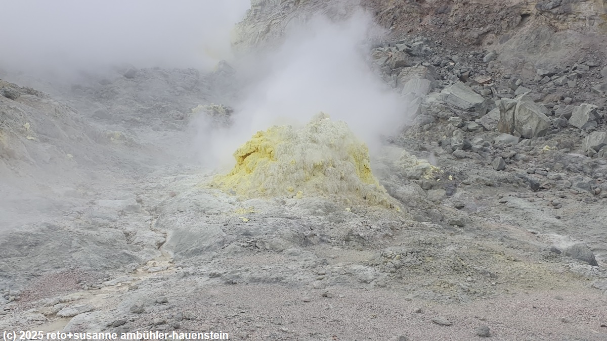 in der nähe des rest houses hat es mehrere stellen, an welchen dampf aus dem boden steigt. das gestein zeigt die typische gelbe farbe von schwefel. wir spazieren ein kurzes stück über den tsutsujigahara nature trail richtung kawayu visitor center, dann bewundern wir noch die dampfenden fumarolen.