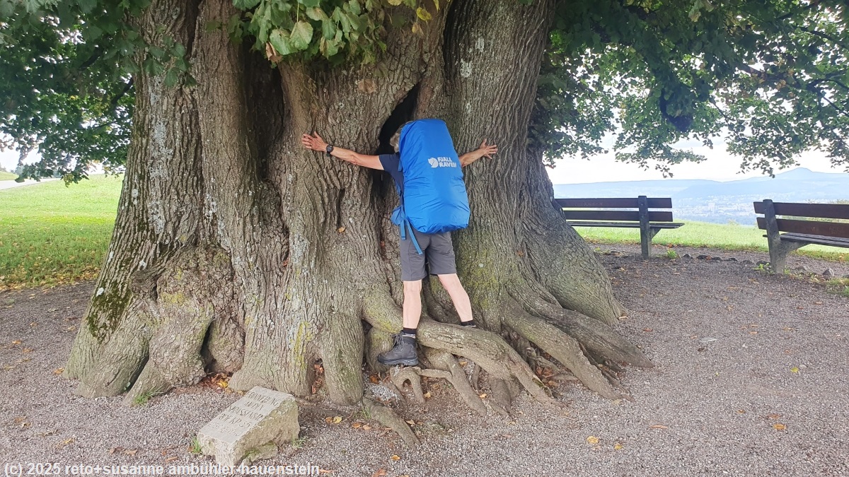 unser handy weckt uns um 07:30 uhr. die nacht war sehr ruhig und der schlaf äusserst erholsam. wir geniessen das reichhaltige frühstücksbuffet im selben restaurant, in welchem wir gestern zu abend gegessen haben. danach geht susanne brötchen einkaufen, während ich schon mal beginne, meinen rucksack zu packen. kurz vor 09:30 uhr machen wir uns auf den weg. die heutige route führt uns über die aare, ab da geht es für die nächsten knapp 10 km fast immer nur aufwärts. der einstieg ist ziemlich heftig, es geht teilweise über treppen steil bergauf. im wald flacht der weg etwas ab. vom hexenplatz haben wir eine schöne aussicht auf die altstadt von brugg. wir kommen gut voran, die beine machen brav mit und die füsse sind zum aushalten. bei riniken geht es durch ein wohnquartier. ein riesiger pneukran hievt gerade ein mächtiges stück baum auf die strasse. wir werden freundlich aufgefordert, die baustelle zu umgehen. nun geht es über offene felder richtung bözberg. wir sind dankbar für die kompakte wolkenschicht, an der prallen sonne würden wir noch viel mehr ins schwitzen kommen. nachdem wir die landstrasse 3 überquert haben, machen wir bei einer sehr schönen bank kurz rast. wir trinken etwas und essen einen stängel. wenig später wandern wir erneut durch einen schönen wald. gegen 11:45 uhr erreichen wir die mächtige linner linde. der stamm dieser linde soll gemäss diverser quellen einen umfang von 11 meter haben, ihr alter wird auf 700 bis 800 jahre geschätzt. wieder steigt der weg steil an. die letzten höhenmeter vor dem höchsten punkt des linnerberg haben es in sich, der weg ist schmal und sehr steil. dabei überqueren wir die autobahn A3, die tief unter uns in einem tunnel durch den bözberg führt. auf dem höchsten punkt picknicken wir auf einer der bänke.