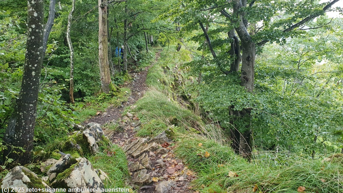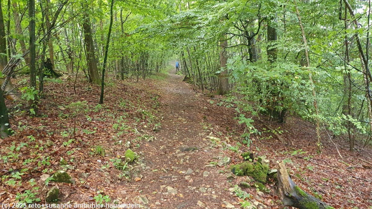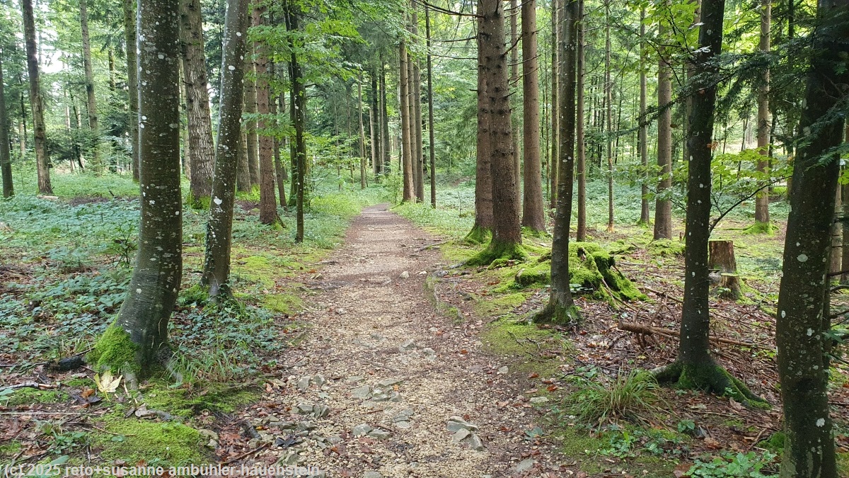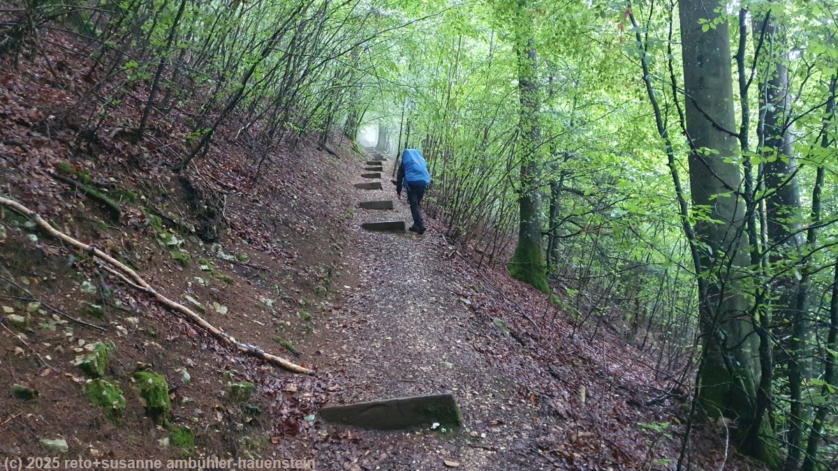 unser handy weckt uns um 07:30 uhr. im restaurant erwartet uns ein schönes buffet mit allem, was wir zum frühstück haben möchten. gut verköstigt gehen wir wieder aufs zimmer und packen unsere rucksäcke. in der nacht und auch am morgen hat es immer wieder kurze und teilweise heftige regengüsse gegeben. als wir kurz vor 09:30 uhr aufbrechen, hangen dunkle wolken am himmel und es fallen einige tropfen. die heutige etappe ist ein permanentes auf und ab. obwohl das tagesziel tiefer liegt als der startpunkt, müssen wir fast 770 höhenmeter bewältigen. nach einem kurzen flachen stück zu beginn, steigt der weg bald kräftig an. der aufstieg zur 963 meter hohen geissflue erfolgt in vier abschnitten. zuerst erklimmen wir das 674 meter hohe benkerjoch, dann geht es hinauf zur "uf der egg" auf 800 m.ü.m. wir gehen durch einen schönen wald, der aber nur selten den blick in die weite frei gibt. vorallem richtung westen haben wir ab und zu eine aussicht. das wetter bleibt wechselhaft, immer wieder fällt regen, manchmal etwas intensiver, aber immer nur für kurze zeit. um 11:30 uhr erreichen wir das waldgasthaus chalet saalhöhe.