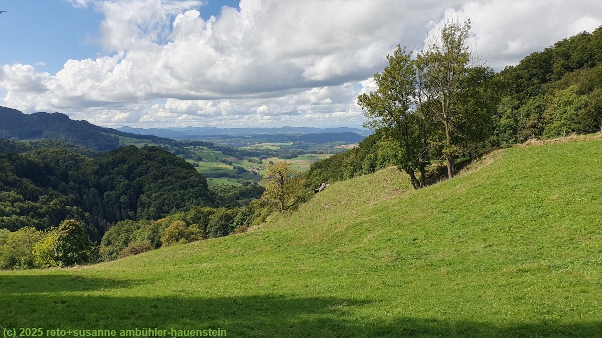 der himmel ist etwas freundlicher geworden, gelegentlich scheint die sonne. meine frau möchte aber nicht hier zu mittag essen, sondern noch bis zur schafmatt weitergehen. der steile abstieg ist anfangs ziemlich rutschig, weiter unten hat es weniger steine, hier lässt es sich leichter gehen. bei der hütte schafmatt picknicken wir an einem tisch am waldrand. im weiteren verlauf der wanderung wechseln sich offenes gelände und wald immer wieder ab. am leutschenberg vorbei geht es richtung burgchopf. als wir aus dem wald kommen, folgt ein für mich typischer abschnitt des jura-höhenweges: wir wandern über ausgedehnte weiden. die meisten sind unbenutzt, aber mindestens zwei mal hat es kühe auf der weide. einige beäugen uns argwöhnisch, sie verhalten sich aber alle friedlich. gegen 15:40 uhr erreichen wir froburg. auf der terrasse erfrischen wir uns mit einem kalten getränk. nun sind es noch knapp drei kilometer bis zum tagesziel. ein stück weit müssen wir auf der strasse gehen. als der wanderweg von dieser abbiegt, folgt nochmals ein kurzer, aber steiler aufstieg. danach geht es hinunter zum ort hauenstein-ifenthal.