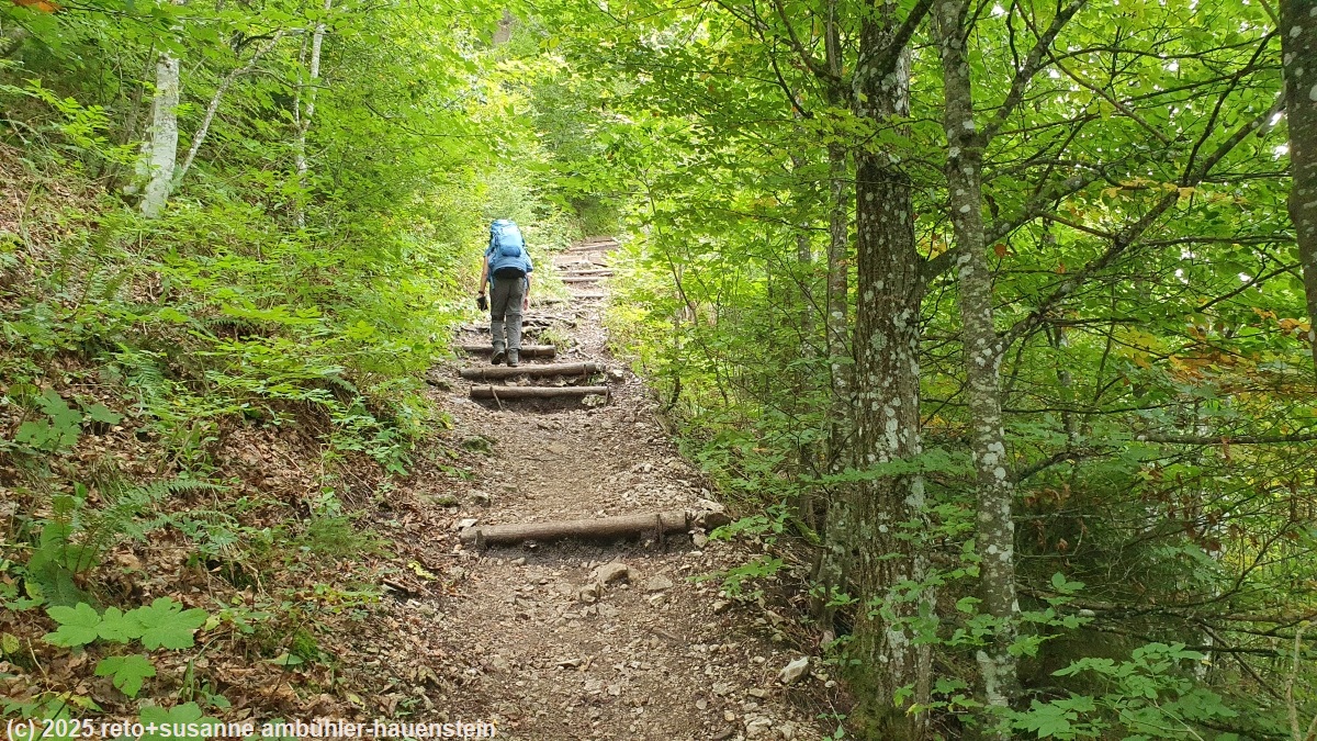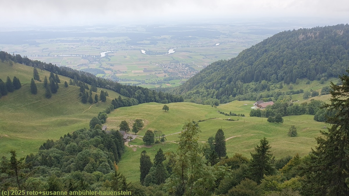 wir lassen uns wiederum um 7 uhr wecken. das frühstücksbuffet ist äusserst reichhaltig. wir dürfen an einem tisch am fenster sitzen. allerdings ist die aussicht eher trüb. bevor wir losmarschieren, verpflastern wir noch meine füsse. die ersten 3 km sind einfach zu begehen. wir wandern über feldwege mit meistens leichter neigung. das wetter ist weiterhin trüb und neblig. dann beginnt der ziemlich steile aufstieg zur hasenmatt. wir gehen meist durch dichten wald, gelegentlich auch über wiesen. am höchsten punkt befinden wir uns auf 1445 m.ü.m.