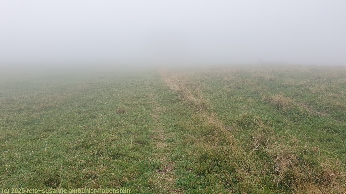 nach dem kahlen gipfel folgt ein steiler und wegen der nassen steine etwas rutschiger abstieg. kaum haben wir den tiefsten punkt erreicht, geht es genau so steil wieder aufwärts. kurz unter dem höchsten punkt machen wir einen kurzen halt, essen einen stengel und trinken etwas. es folgt ein eher flacher abschnitt über offene wiesen. der nebel ist so dicht, dass man keine 30 meter weit sieht. trotzdem sehen wir gelegentlich bis ins tal hinunter. wir erkennen grenchen und die piste des flugplatzes. der pfad verläuft auf gleichbleibender höhe durch viehweiden. in der nähe von oberberg gelangen wir auf eine asphaltierte strasse. das ist zwar unsere am wenigsten geschätzte unterlage, hat aber den vorteil, dass man mit wenig energieaufwand relativ rasch voran kommt. dies gilt ganz besonders, wenn die strasse leicht abwärts führt. in einer waldschneise hat es einen skilift, der aussieht, als ob er noch in gebrauch ist. wenig später wandern wir an einem zweiten skilift vorbei. beim restaurant untergrenchenberg picknicken wir auf einer bank vor der sternwarte auf der anderen strassenseite. während wir essen, bläst ein kühler wind und es fallen einige regentropfen. das restaurant hat - wie alle gasthöfe an unserer heutigen route - ruhetag. so müssen wir ohne kaffee auskommen.