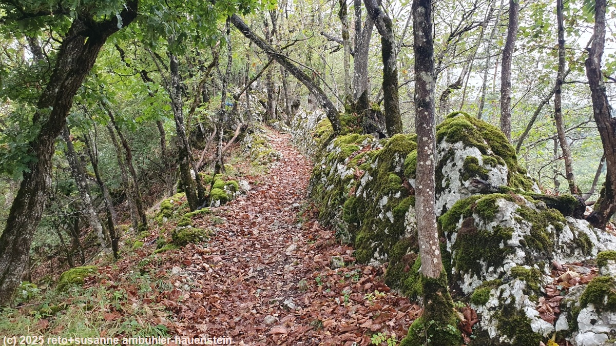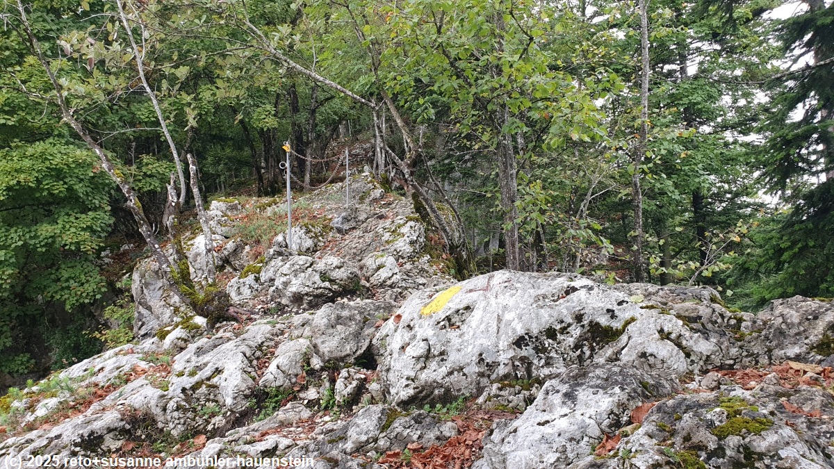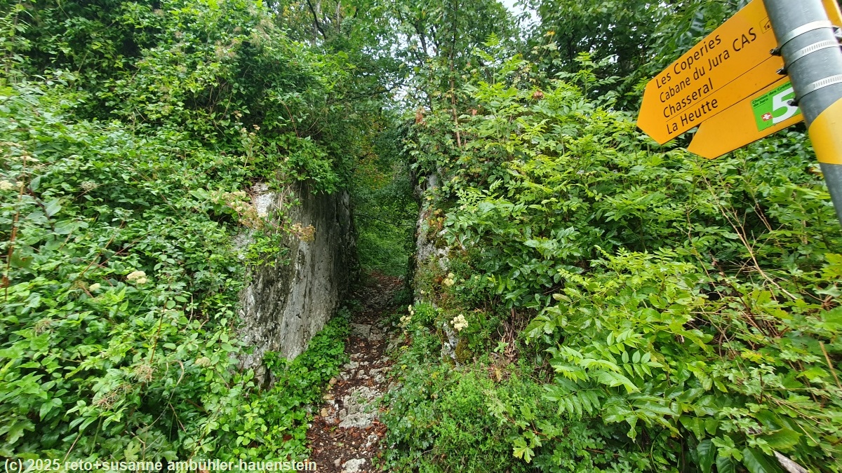 unser handy weckt uns um 06:15 uhr. in der nacht hat es geregnet und der wind hat im innenhof geheult wie ein räudiger hund. wir frühstücken in der gemeinschaftsküche. kurz vor acht uhr verlassen wir die unterkunft und marschieren richtung bahnhof. unterwegs stocken wir unseren vorrat an blasenschutzpflaster auf. die zugfahrt nach frinvillier-taubenloch dauert nur gerade sechs minuten. die ersten 700 m sind lockeres einlaufen entlang der strasse, dann geht es durch einen spalt im felsen zum langen und steilen aufstieg richtung les coperies. auf knapp 4 km steigt der pfad um 600 meter. der weg ist manchmal etwas steinig und rutschig, im allgemeinen aber gut zu begehen. eine stelle ist etwas ausgesetzt, dort hat es ketten um sich festzuhalten. wir wandern durch einen schönen wald, aber unter uns hat es viel industrie und von irgendwo hört man lästigen baulärm. der schweizer jura ist in bezug auf lärmbelästigung nicht mit nordskandinavien zu vergleichen. dort können wir tagelang in absoluter ruhe wandern, in der schweiz gibt es immer strassen-, flug-, schiess- und/oder industrielärm. je höher wir kommen desto weniger laut ist es. nachdem wir die ersten 600 höhenmeter überwunden haben, marschieren wir durch ausgedehnte weiden. auf manchen hat es viele kühe. meistens sind diese sehr entspannt, aber auf einer weide beginnen die tiere von uns weg zu rennen. sie versammeln sich unglücklicherweise immer wieder auf dem weg. wir versuchen sie zu umgehen, aber sie laufen trotzdem weg. selbst als der weg dem waldrand entlang geht, hat es vieh. susanne ist es gar nicht wohl, aber die tiere sind nicht agressiv und wenn ich mit ihnen spreche, dann trotten sie irgendwann davon. auf einem baumstrunk machen wir kurz rast. der weg ist nun ein auf und ab. die landschaft scheint uns für den jura sehr typisch. es tauchen auch die ersten trockensteinmauern auf.