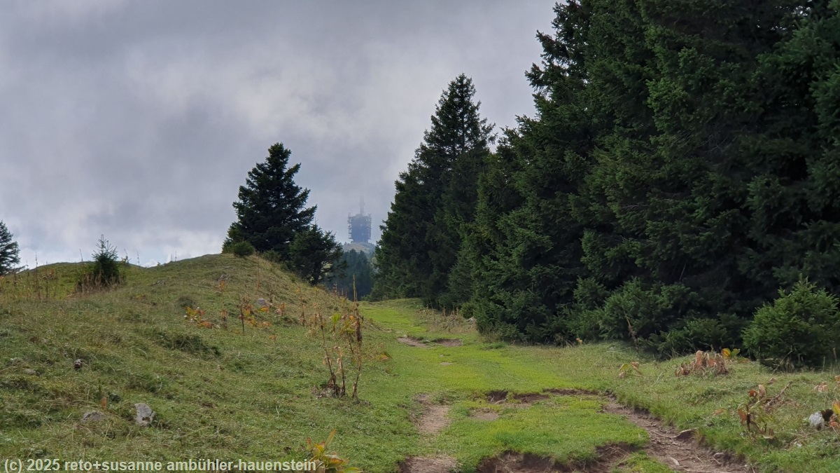 blick zurück während dem aufstieg zum chasseral wolkenumhüllter turm auf dem gipfel des chasseral