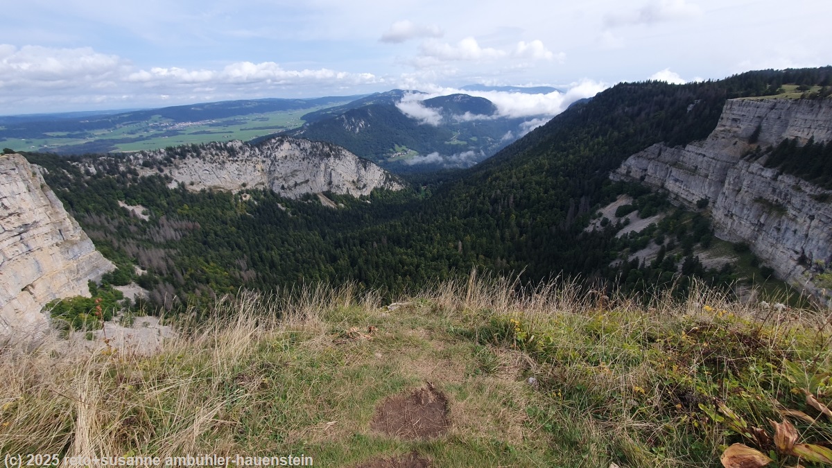 unser handy weckt uns um 07:30 uhr. wir haben wunderbar geschlafen. um 8 uhr sind wir im restaurant und geniessen das frühstück. für einmal gibt es kein buffet, sondern ein klassisches frühstück mit orangensaft, kaffee, tee, brot, butter und konfiture. kurz nach 9 uhr sind wir startklar. vor uns macht sich gerade eine grössere gruppe auf den weg. schon bald beginnt der lange und steile aufstieg zum creux du van. bei einer weggabelung steht ein grossteil der gruppe und wartet auf die nachzügler. unglücklicherweise lassen wir uns von den vielen menschen ablenken und bemerken nicht, dass diese wanderer gar nicht dem jura-höhenweg folgen. so erklimmen wir die ersten 300 höhenmeter nicht auf der vorgesehenen route, sondern auf einer forststrasse parallel zum höhenweg. bei les oeillons kommen die beiden wege wieder zusammen. nun windet sich der schmale pfad in vierzehn kehren weitere 400 meter den berg hinauf - passend heisst der aufstieg "sentier de 14 contours". die ersten kehren sind weit voneinander entfernt, doch je höher wir kommen, desto rascher folgen sich die kehren. um 10:50 uhr erreichen wir den rand des creux du van. damit sind wir aber noch nicht auf dem höchsten punkt angelangt. der krete entlang steigt der weg weiterhin an. die aussicht auf die halbrunde felswand, aber auch ins tal richtung neuenburgersee - welcher wegen den wolken allerdings nicht zu sehen ist - und ganz besonders ins vallée des ponts ist atemberaubend. immer wieder stoppen wir bei einem weiteren aussichtspunkt und machen nochmals einige bilder. nachdem wir die hälfte des creux du van umgangen haben, zweigt der weg nach rechts ab.