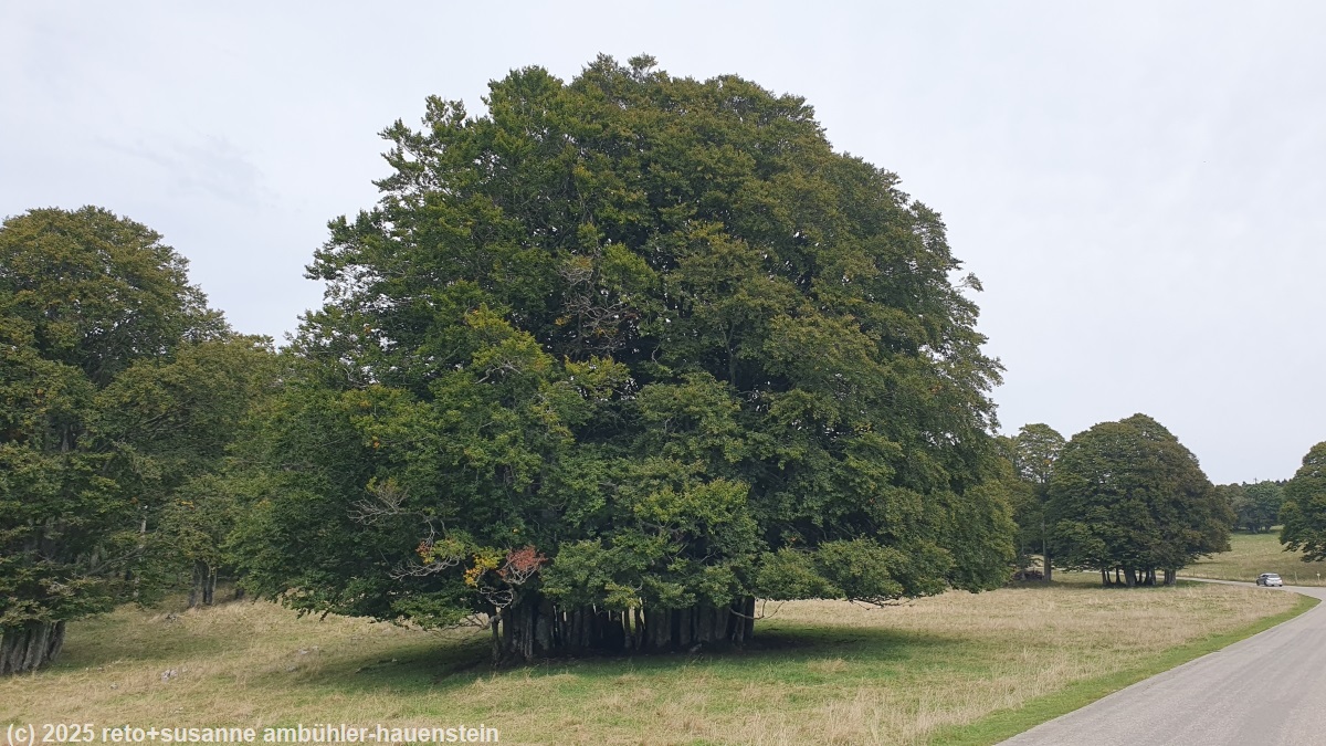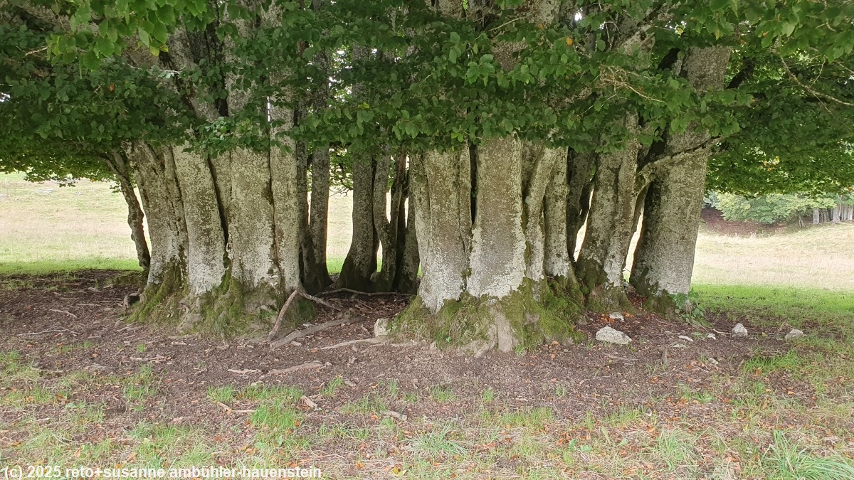 wir verlassen die spektakuläre felswand und wandern abwärts. erst über weiden, dann durch wälder und zu oft auf asphaltierten strassen. mittag ist schon lange vorbei, wir würden gerne picknicken, aber auf diesem abschnitt ist das schwierig. links und rechts der strasse hat es mauern und zäune, gelegentlich einen parkplatz, aber weit und breit keine sitzgelegenheit. bemerkenswert sind dagegen die "mikrowälder". auf den ersten blick scheint es, als hätten wir einen einzelnen, mächtigen baum vor uns. aber beim genauen hinsehen erkennen wir zahlreiche stämme.