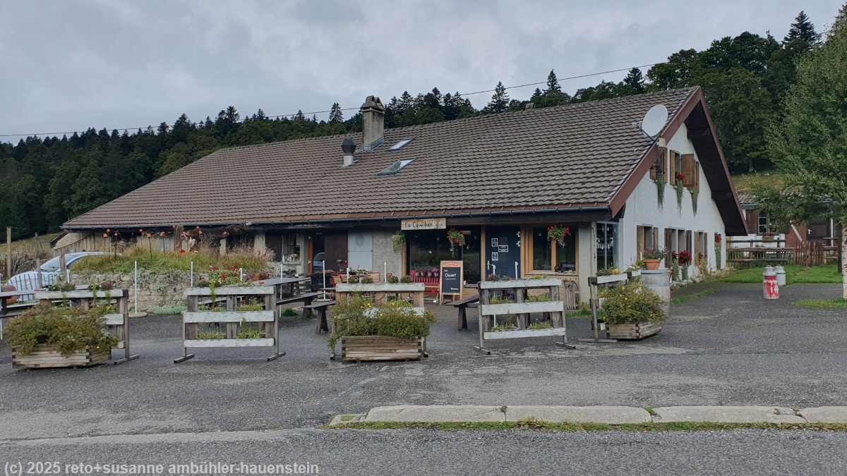 als der wanderweg endlich von der strasse abbiegt, setzen wir uns auf eine steinmauer in einer weide und essen zu mittag. die restliche strecke bis zum restaurant la combaz ist etwas weniger spektakulär. es geht auf und ab, über weiden und durch wälder, aber mit wenig aussicht. zudem ziehen immer mehr wolken auf. um 15 uhr erreichen wir das tagesziel unserer wanderung, la combaz.