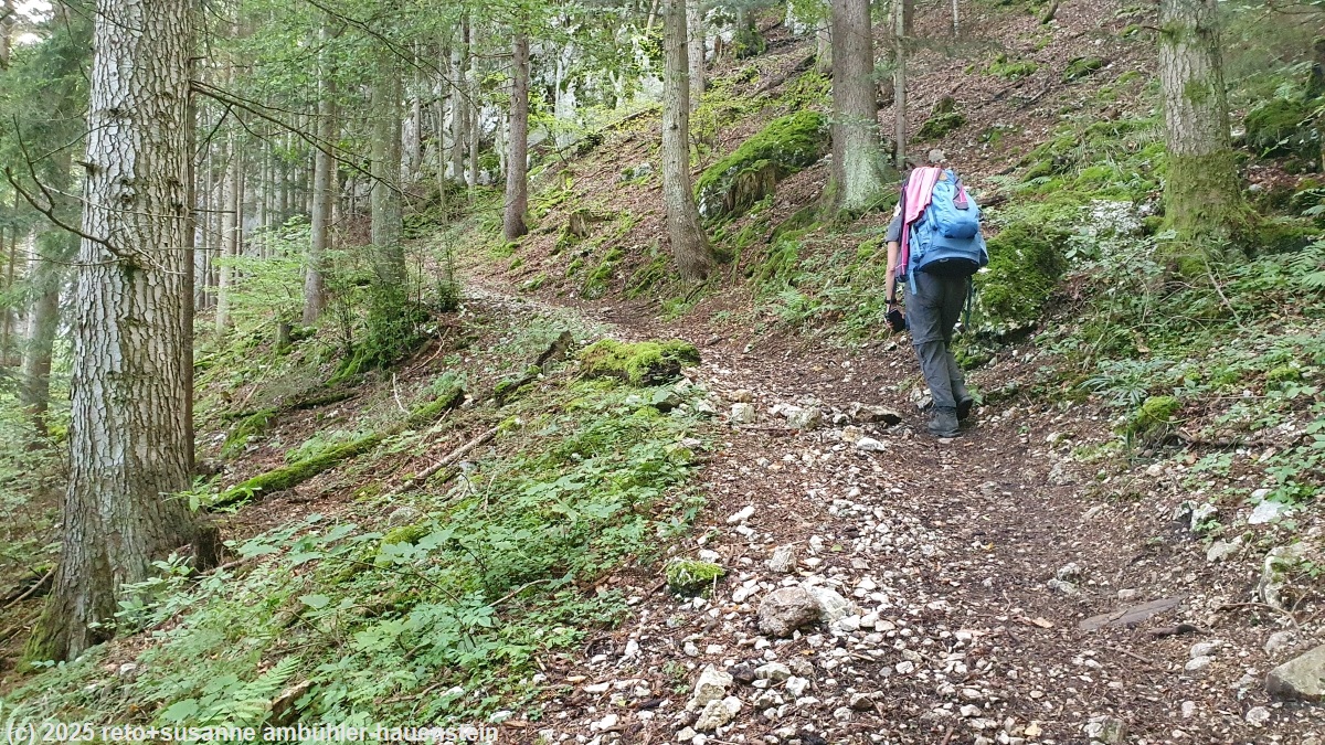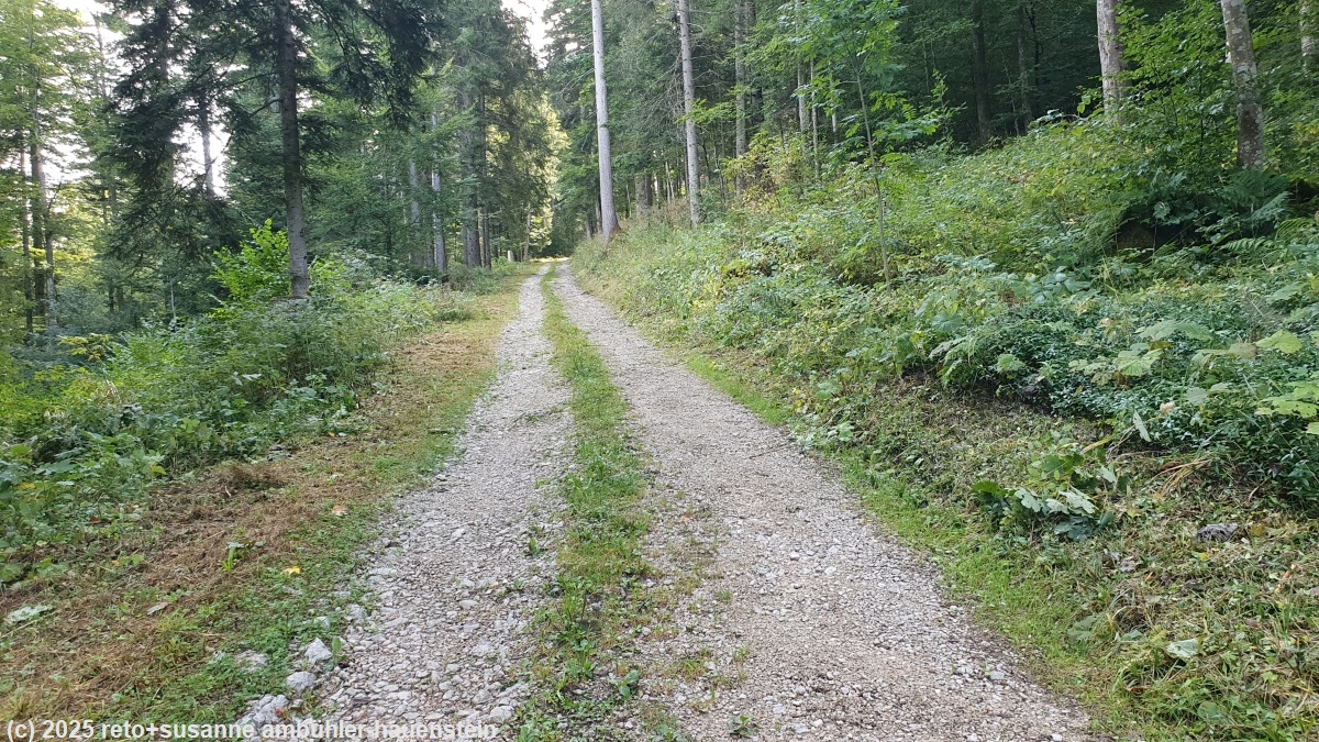 | leichter aufstieg über waldstrasse richtung sur le voué | steiler aufstieg über pfad richtung sur le voué |