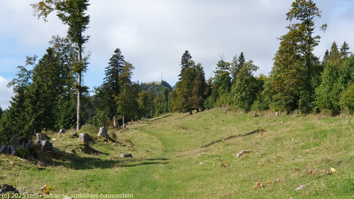 hier beginnt der 6 km lange aufstieg zum dent de vaulion. anfangs gehen wir auf einer waldstrasse. diese überwindet die höhe in einer weiten schleife, dadurch ist der aufstieg nicht so steil. wir unterqueren die bahnlinie ins valle de joux. oberhalb grands crêts verlassen wir die waldstrasse. der schmale pfad führt steil durch den wald zur krete hinauf. wir kommen ordentlich ins schwitzen. vorallem die letzten meter unterhalb der krete sind enorm steil. unvermittelt stehen wir auf einer asphaltierten strasse. wir folgen dieser in westlicher richtung. die strasse endet beim hof la mâche. wir würden gerne eine kurze pause machen, aber es gibt weit und breit keine sitzgelegenheit. erst als wir über eine kleine kuppe kommen, bietet sich ein am bodenliegender stamm als sitzplatz an. wir essen einen stängel und trinken einen schluck. das wetter ist etwas freundlicher geworden, gelegentlich scheint die sonne.