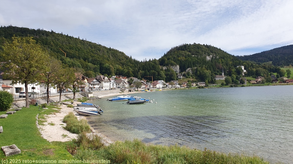 über eine asphaltierte strasse nähern wir uns le pont. dicht neben der strasse steigen wir auf einem steilen pfad zu den ersten häuser hinunter, wenig später sind wir am see. wir folgen dem ufer westwärts. kurz vor 15 uhr sind wir am tagesziel. das hôtel de la truite sieht hübsch aus und hat ein grosses gartenrestaurant.