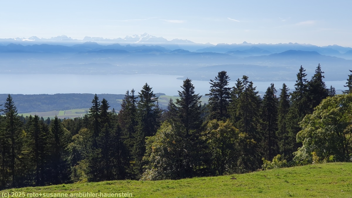 als wir um 07:30 uhr aufstehen, begrüsst uns ein wolkenloser himmel und die morgensonne steigt gerade über die baumwipfel. das frühstücksbuffet enthält alles, was wir brauchen. kurz vor 09:15 uhr marschieren wir los. zu beginn liegt der wanderweg im schatten, das kommt mir sehr entgegen. auf den ersten etwas mehr als 3 km geht es eher abwärts. im wald ist der boden feucht und der weg daher leicht glitschig, egal ob wir auf blanker erde oder auf mit steinen durchsetztem grund laufen. wir überstehen den abschnitt unbeschadet. noch vor dem hof la neuve beginnt der aufstieg zur crêt de la neuve. auf dem gipfel haben wir eine fantastische aussicht auf den genfersee und das gebiet zwischen neuenburgersee und genfersee. von hier oben sieht diese region sehr flach aus. dahinter erheben sich die alpen. wir sehen das ganze panorama, von den bergen in der innerschweiz - zum beispiel den titlis - über die berner alpen bis zu den walliser alpen. wir erkennen auch das matterhorn. nicht zu übersehen ist der mächtige mont blanc.