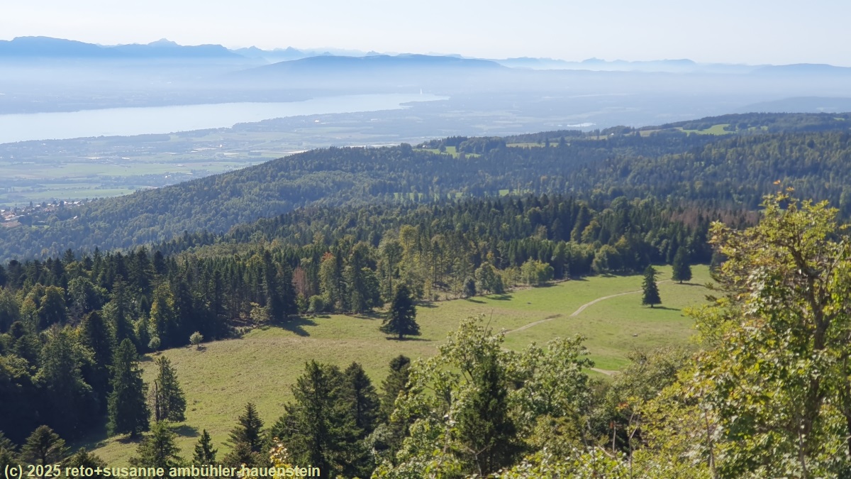 nach einer kurzen pause auf dem mit 1486 m.ü.m. höchsten punkt unserer heutigen wanderung machen wir uns wieder auf den weg. es folgt noch ein zweiter kleiner gipfel, dann geht es bequem abwärts. der wanderweg führt nun abwechslungsweise über weiden und durch wald. auf einer dieser weiden sehen wir zahlreiche kühe mit einem ungewohnt grauen fell - wir nennen sie scherzhaft "eselkühe". im weiteren verlauf der wanderung erkennen wir den la dôle. diesen berg werden wir morgen auf unserer schlussetappe erklimmen. kurz nach 12 uhr gelangen wir unvermittelt an eine feuerstelle am waldrand mit einer traumhaften aussicht auf den genfersee. es hat zwar keine sitzbänke, aber den ausblick kann man auch von einem mehr oder weniger bequemen stein aus geniessen. am westlichen ende des genfersees können wir sogar die wasserfontäne des jet d'eau erkennen. dazu essen wir unsere brote.