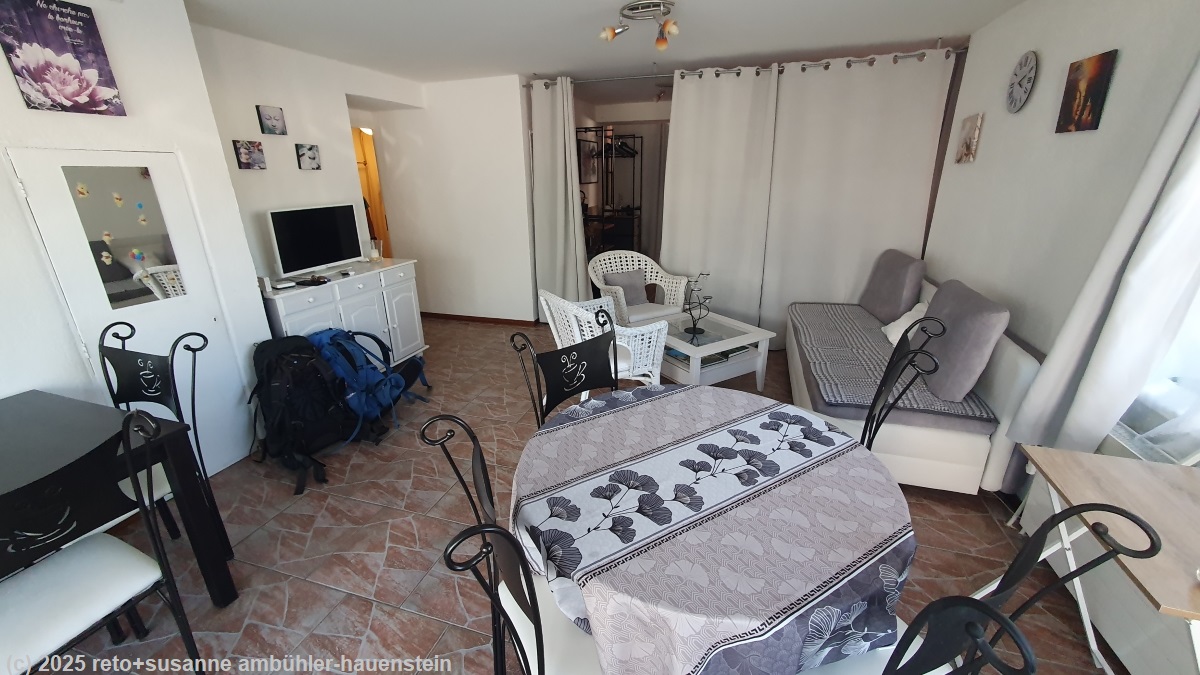 kurz nach 14:30 uhr erreichen wir saint-cergue, den ort, in welchem wir die letzte nacht auf unserer wanderung über den jura-höhenweg verbringen. da wir unsere unterkunft erst ab 16 uhr beziehen können, gehen wir erst in einem lebensmittelladen eine kleinigkeit für morgen einkaufen, danach setzen wir uns bei einer bäckerei mit tea room an ein tischchen vor dem geschäft und erfrischen uns mit kaffee, getränken und einem joghurt. zudem bestellt susanne für morgen sandwiches. an unserem letzten tag haben wir einen engen zeitplan, weil wir am nachmittag mit dem zug nach hause reisen wollen, um noch mit unserer enkeltochter geburtstag zu feiern. gegen 15:30 uhr brechen wir wieder auf und spazieren durch den ort um ein restaurant für's nachtessen zu finden. danach setzen wir uns beim spielplatz des schulhauses in den schatten eines baumes und beobachten das treiben. wir wundern uns ein bisschen, was hier genau läuft. die schulkinder vergnügen sich auf dem spielplatz und es sind sowohl lehrpersonen als auch eltern präsent. um 16 uhr marschieren wir zu unserer unterkunft. die dame, welche die unterkunft "au rayon de soleil" betreibt, wartet bereits vor dem eingang. die "suite" ist ein grosszügiges studio mit vier betten in zwei getrennten bereichen, einem badezimmer mit WC und dusche und einem grossen aufenthaltsbereich mit zwei tischen, sieben stühlen, einem sofa und zwei sessel. einziger wermutstropfen ist die baustelle vor dem haus. die dame des hauses verspricht allerdings, dass es bei den betten im hinteren bereich sehr ruhig sei.